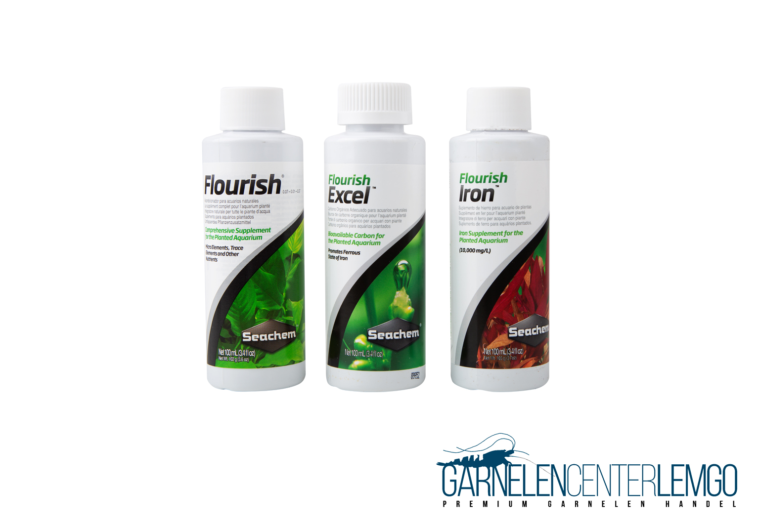 Das Seachem Plant Pack - Fundamentals enthält je 100 ml Flourish, Flourish Iron und Flourish Excel - einen Komplettdünger, einen Eisen- und einen Kohlenstoff Dünger.